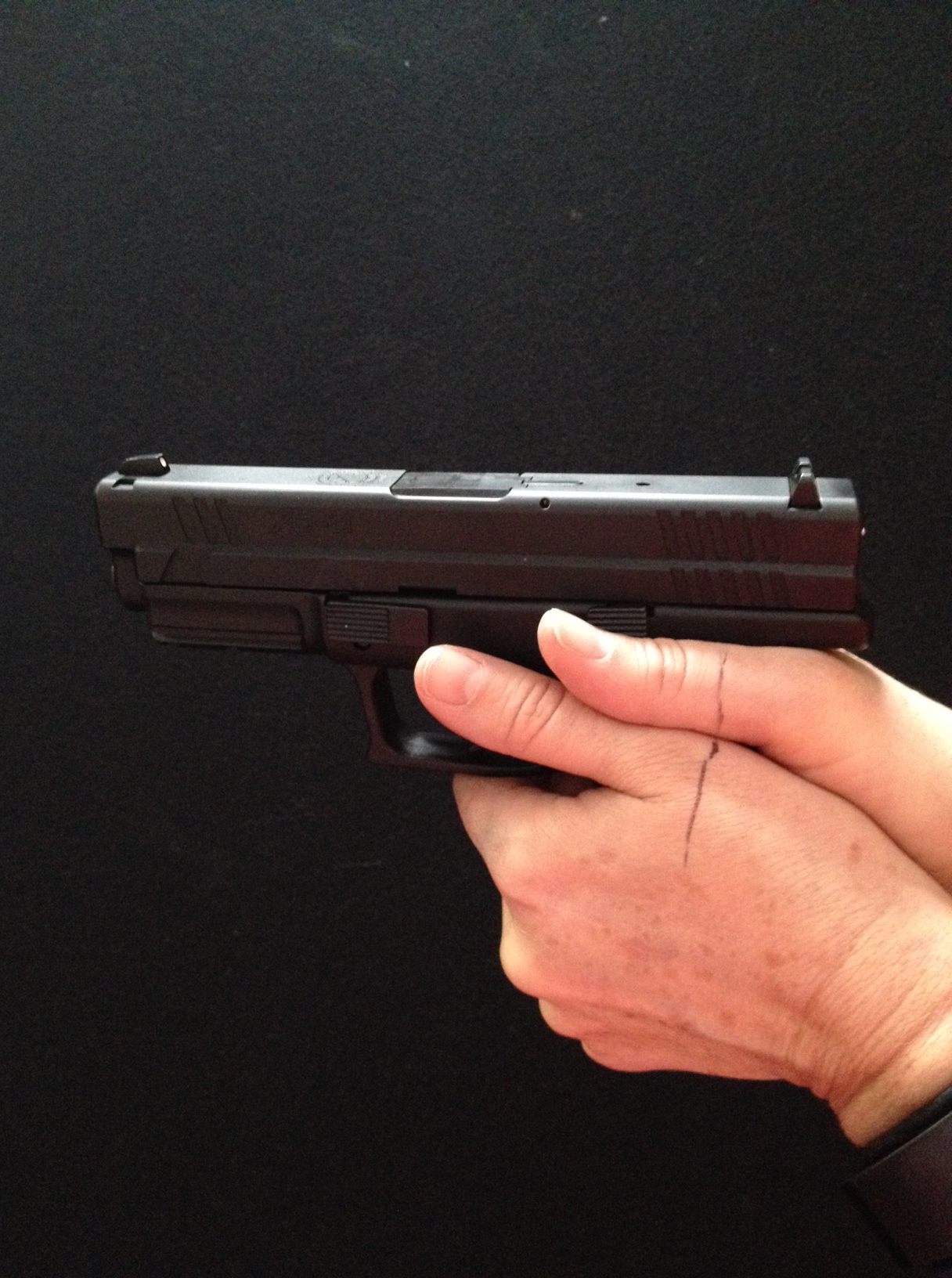 One sure way to get a slide bite is crossing your thumbs behind the firearm. In a two-handed grip, your thumbs should be together, whether you choose high or modified, but they should not be crossed behind the firearm. Doing so places you in position to catch the soft, fleshy tissue between your thumb and forefinger in the slide as the firearm discharges. (Though I have never done so, I have seen pictures and it looks extremely painful!)