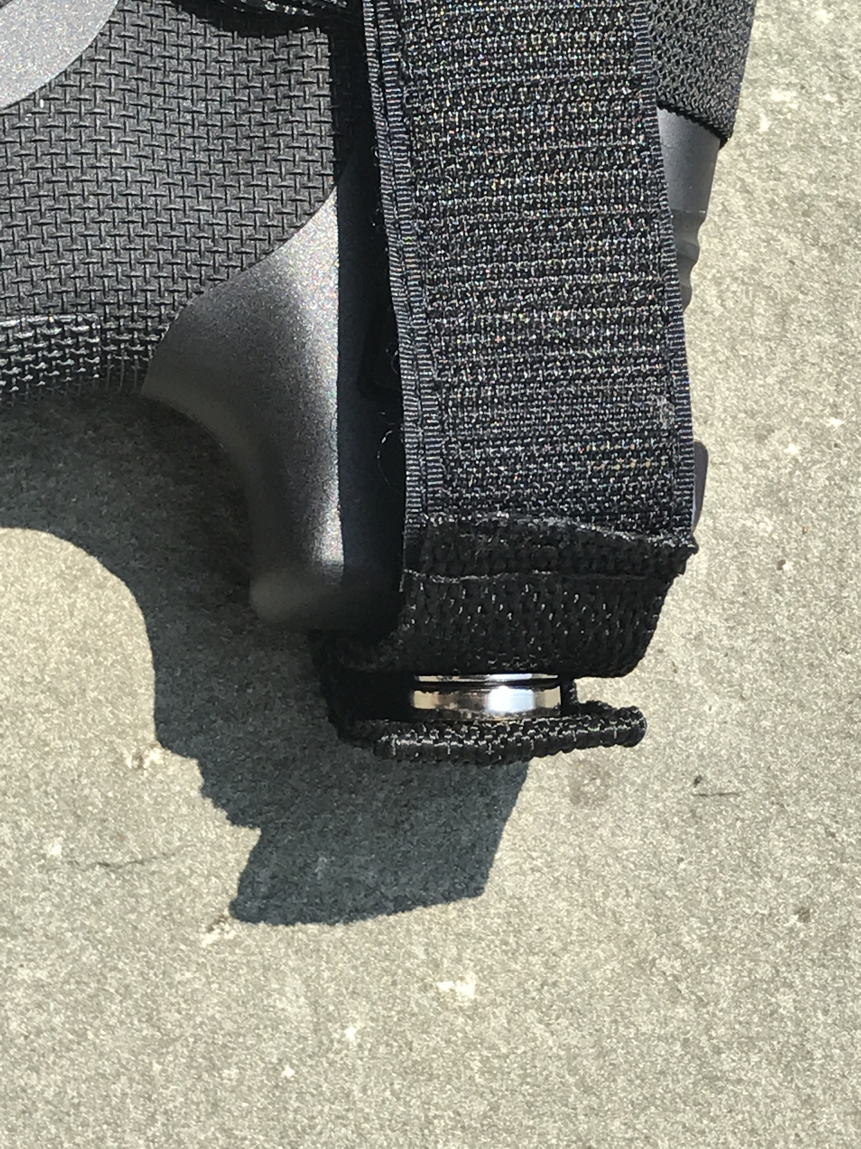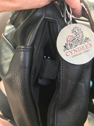 The holster in Cyndee’s purses are a little different than those of other conceal carry purses. It’s fully adjustable to customize to your pistol. Secured with Velcro on both sides of the holster pocket, Cyndee’s holster has an adjustable thumb break that holds your pistol from sliding out of the holster itself. Once your pistol is properly placed in the perfect place for your draw, it stays put. To remove your gun, simply disconnect the magnetic thumb break and draw. The holster pocket is accessible by bilateral, lockable zippers. Cyndee’s recommends locking the side where your muzzle is. She also includes a Cyndee’s bag tag and recommends it be placed on the side of your purse where your pistol access is, that way you always know which zipper to grab should the need arise.