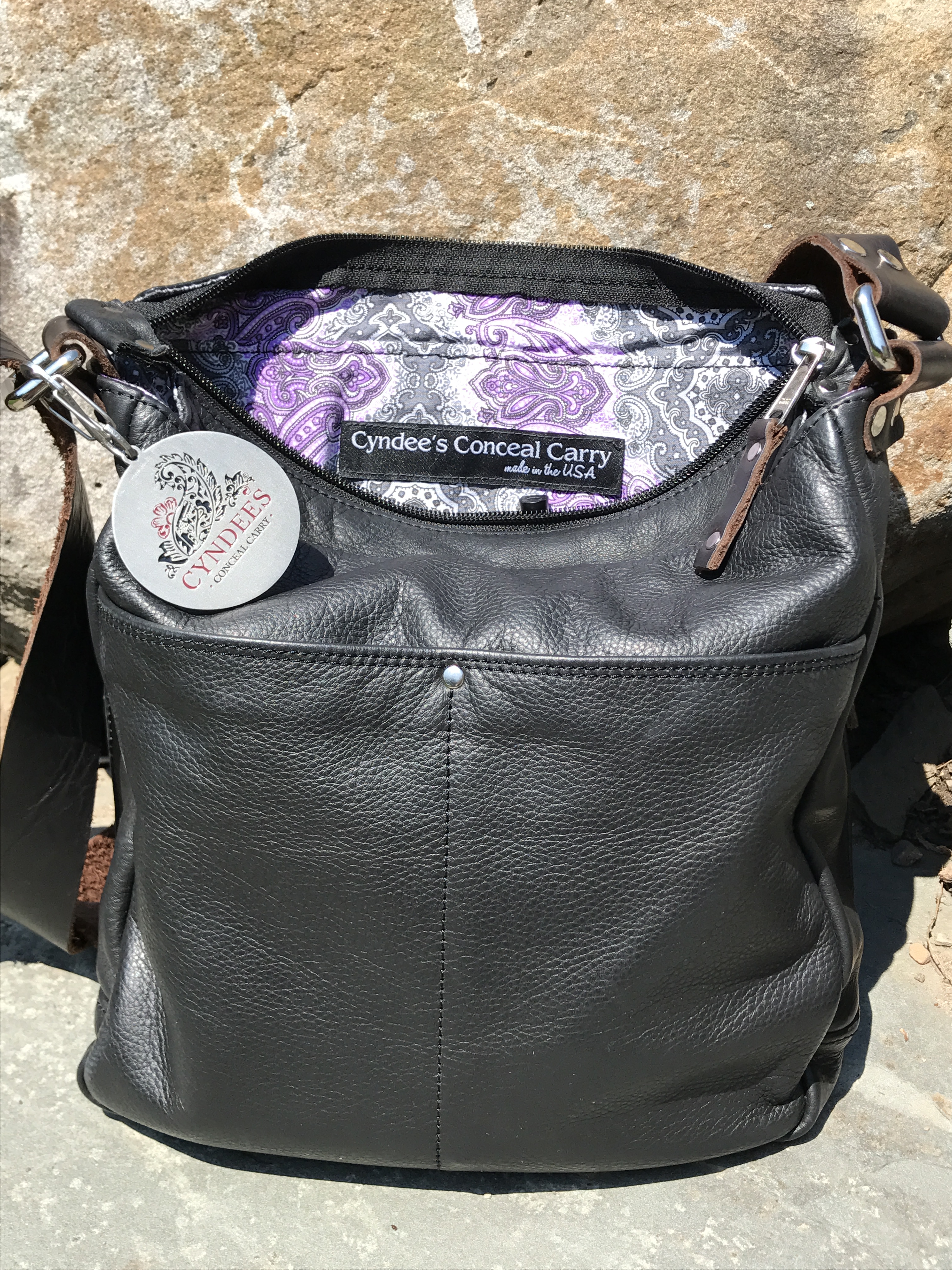Every purse that Cyndee’s manufactures is made in America. They also ALL have a beautiful paisley liner. My purse has a gorgeous purple and black paisley liner, which looks awesome against the black leather. Several other color choices are available for you to choose.